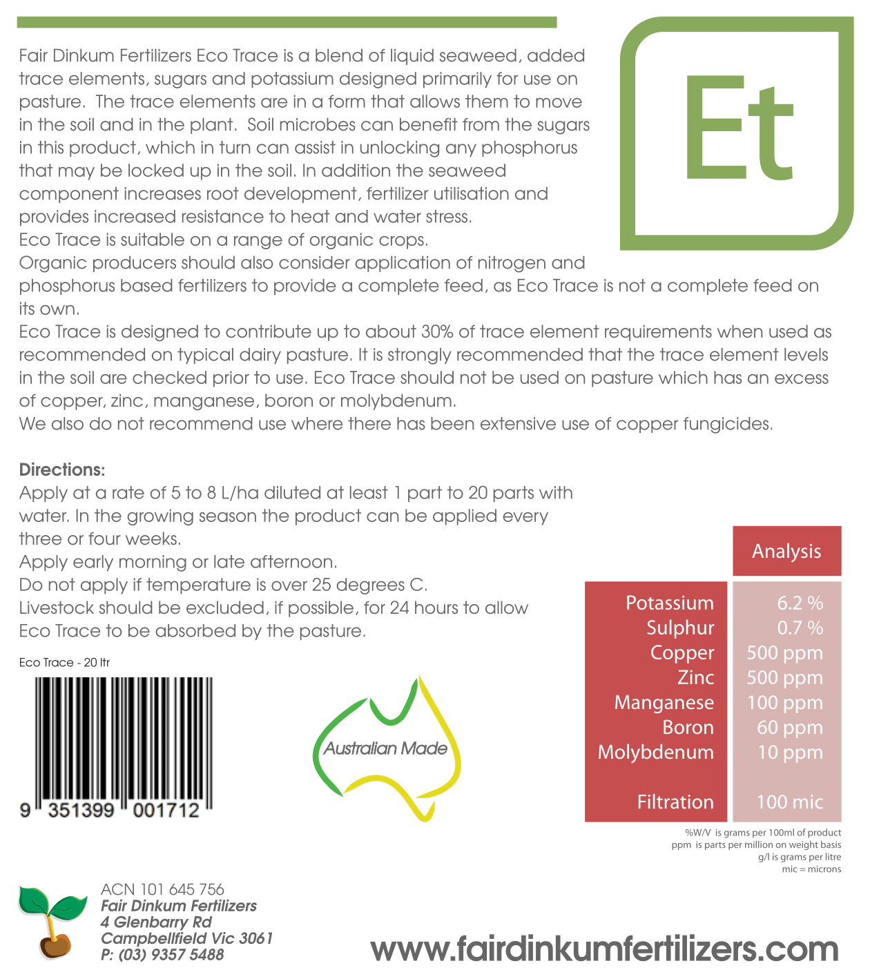 An Australian Bull Kelp extract which contains micro nutrients in a form suitable for animal nutrition. It can be applied by pouring over feed or via drinking troughs. It improves cattle fertility in areas where the soil is deficient in copper, zinc and cobalt.